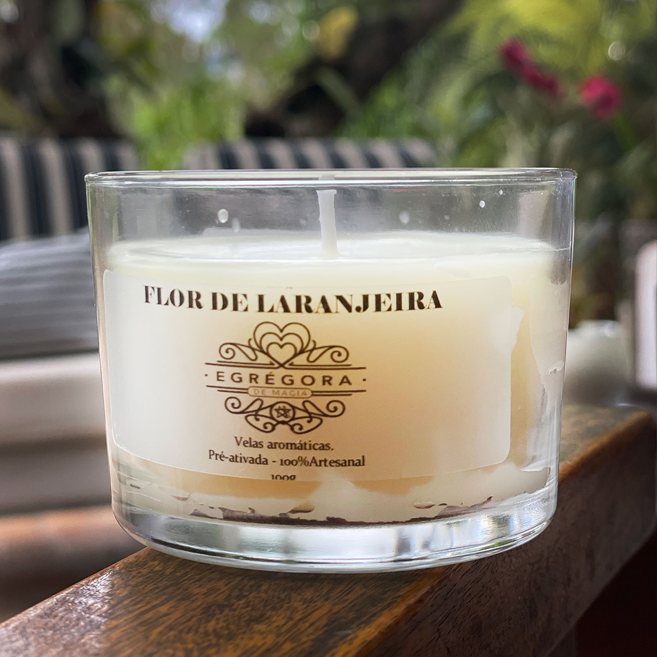 Composição: Parafina, cera vegetal de soja 100%, fragrância de Flor de Laranjeira e Pavio 100% algodão.