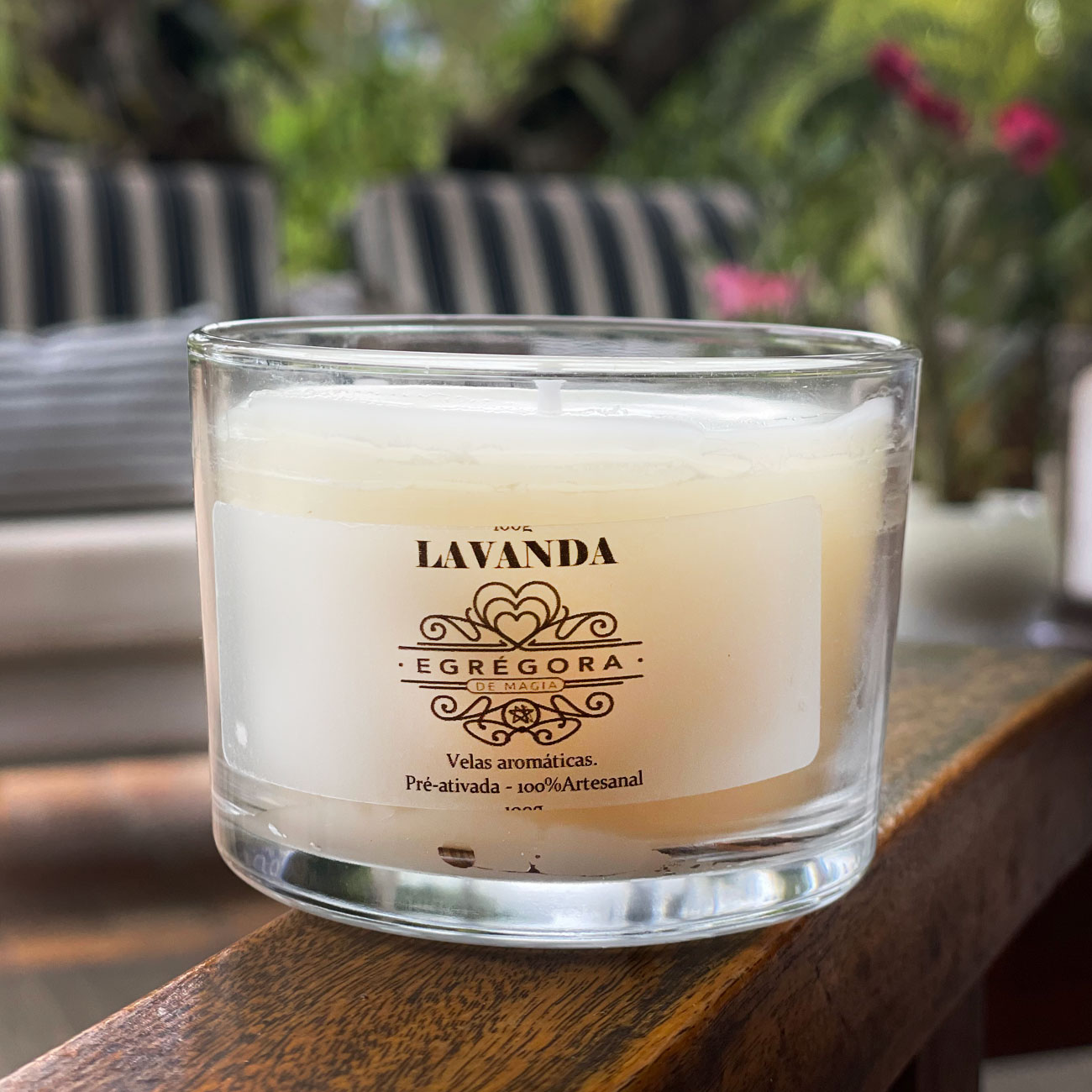 Composição: Parafina, cera vegetal de soja 100%, fragrância de Lavanda e Pavio 100% algodão.